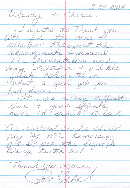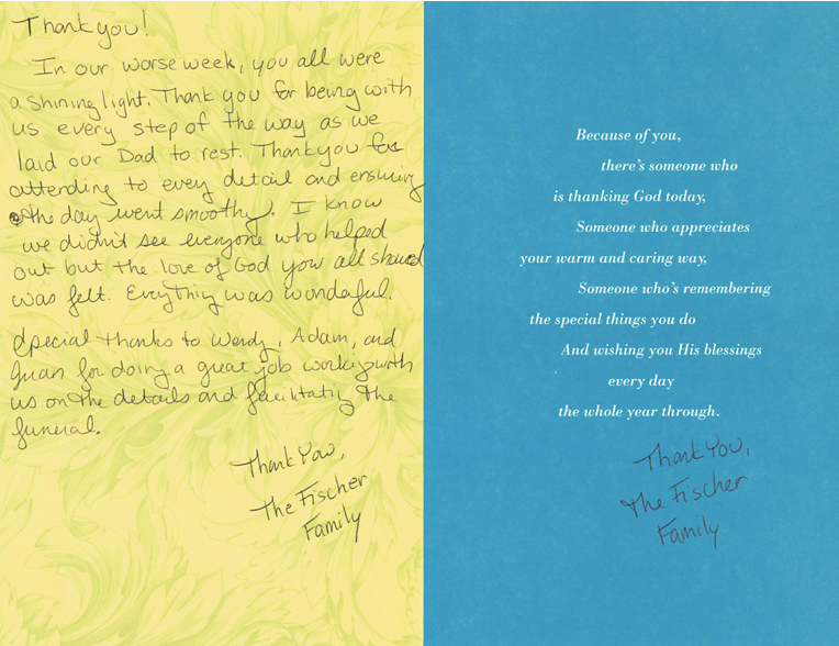 It is our greatest pleasure to hear from families we've served after the service is over. We receive many letters, cards and emails thanking us for our care and attention during their time of need and those words warm our hearts and affirm that we are truly here to serve.