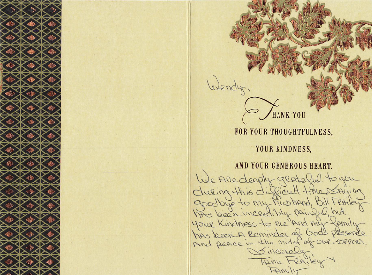 We are deeply grateful to you during this difficult time. Saying goodbye to my husband, Bill Frailey has been incredibly painful, but your kindness to me and my family has been a reminder of God's presence and peace in the midst of our sorrow.