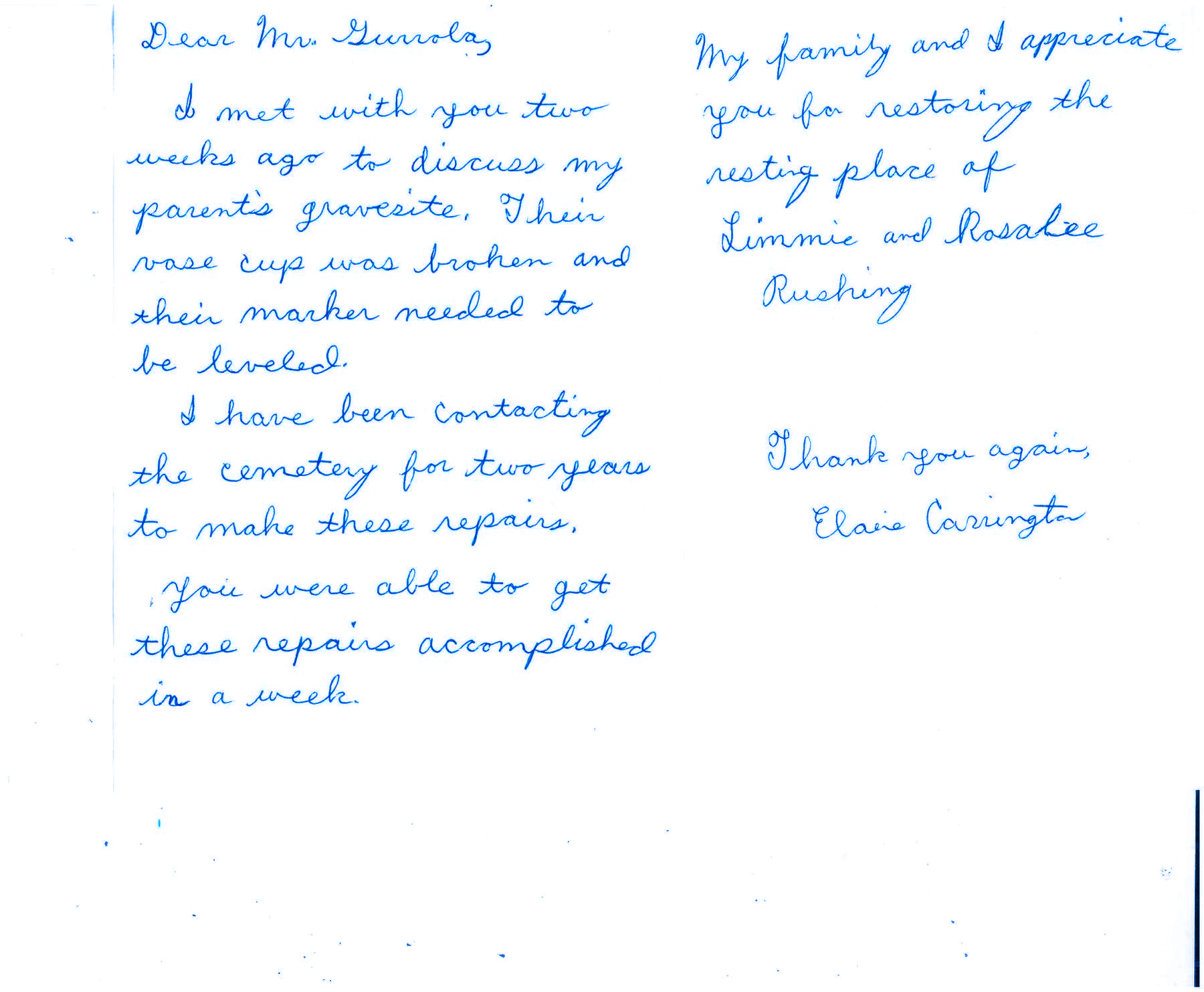My family and I appreciate you for restoring the resting place of Limmie and Rosalee Rushing.
