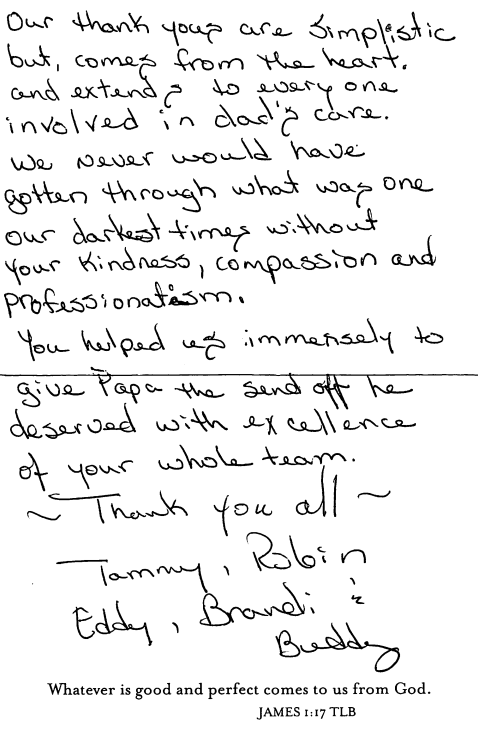 Our thank yous are simplistic but comes from the heart and extends to everyone involved in dad's care. We never would have gotten through what was one of our darkest times without your kindness, compassion and professionalism.