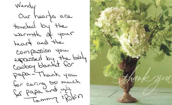 Our hearts are touched by the warmth of your heart and the compassion you expressed by the lovely cowboy blanket for papa - Thank you for caring so much for papa and us.
